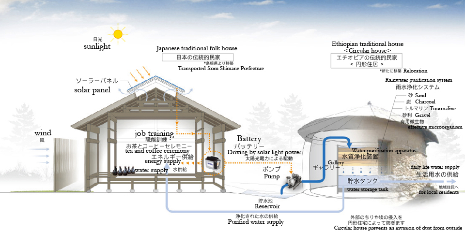 The Japanese Pavilion operates as a socio-cultural center to perform music, dancing, and other performing arts, or to exhibit and sale items related to these arts. On the other hand, the Ethiopian Pavilion operates as a gallery as well as a water distribution depot for the neighbourhood. The pavilion is equipped with a system which collects and naturally purifies the rain water.
