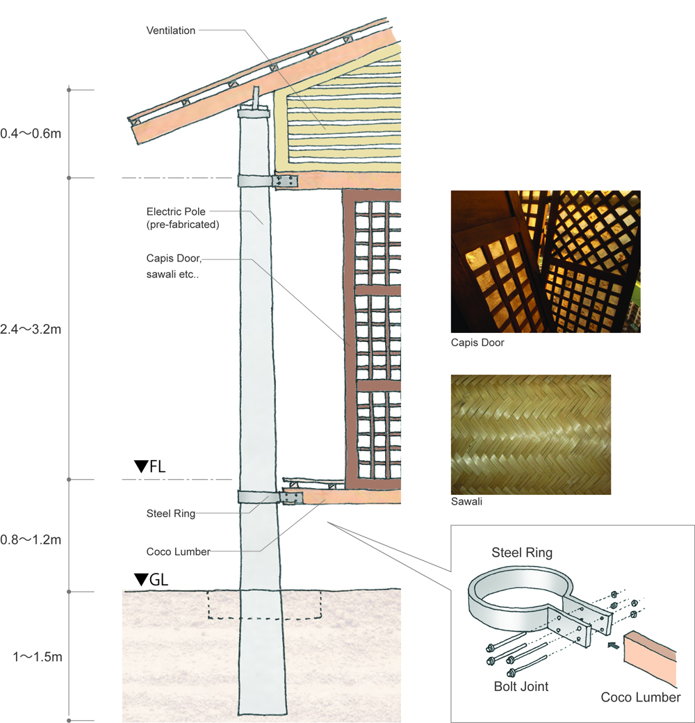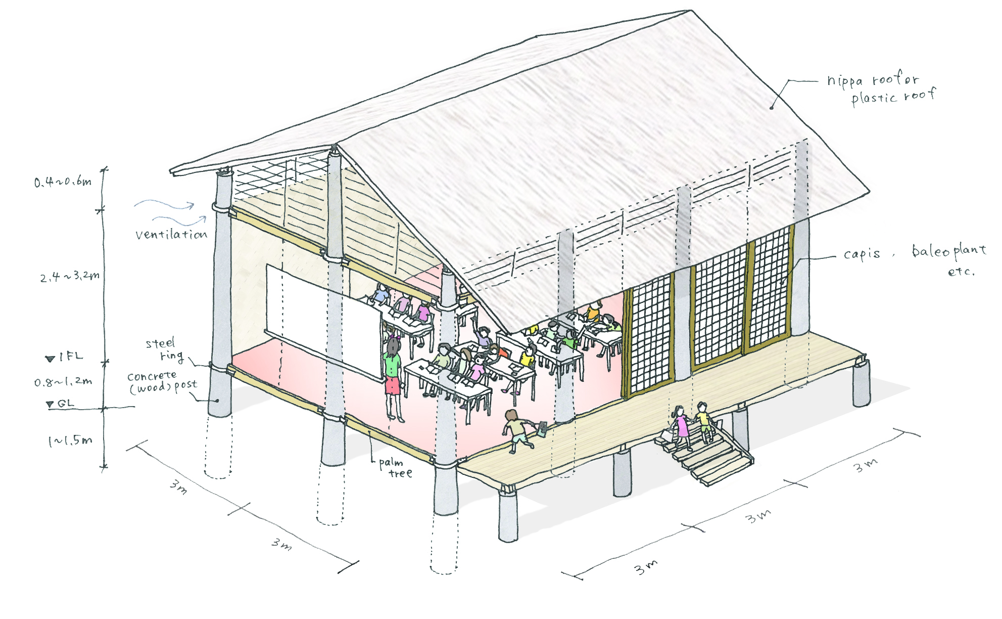 | Background | Typhoon Haiyan struck the Philippines islands of Samal, Leyte, and Cebu particularly hard. A combined death and missing toll of 7,900 people was recorded and 35 million people were forced from their homes. Of these 35 million, 2 million entered emergency relief housing while the remaining 33 million citizens took shelter along roadsides, in structural unsound buildings, and small make-shift shacks. The three organizations behind this project, NCS, Fuji Women's University, and the University of San Carlos have established these three goals: 1. Improvement of the living environment for temporary housing (Daanbantayan City, Cebu Island) 2.Reconstruction of local schools (Tacloban City, Leyte Island) 3. Repair and reconstruction of religious buildings (Loboc City, Bohol Island)